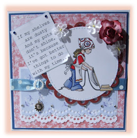 ...I used Belle Hoovering and she was an absolute dream to colour, even though I only have one red Promarker!  (I used Walnut for the shading on the red areas)  I think I made this card with myself in mind when it came to the sentiment which reads 'If my shelves are dusty and my pots don't shine, it's because I've got better things to do with my time...', inside it reads '...like crafting!  Happy Birthday to a very crafty friend!'